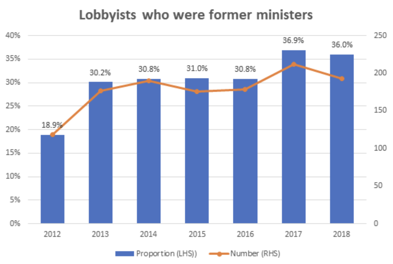 The Grattan Institute’s work also revealed how pervasive lobbying is for former senior politicians. In 2018, 36% of lobbyists on the national register were former state or federal ministers or assistant ministers. That’s more than 200 people.