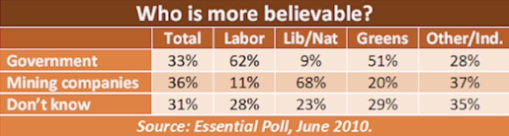 Polling showed that even though public support for the tax declined over the campaign, it remained strong. The Essential poll taken in late May 2010 found 43% in favour and 36% against. But trust was a bigger problem for the government. Although the trust question was split heavily along party lines, a government trying to make a big change against strong opposition needs to have more community trust than this poll revealed.