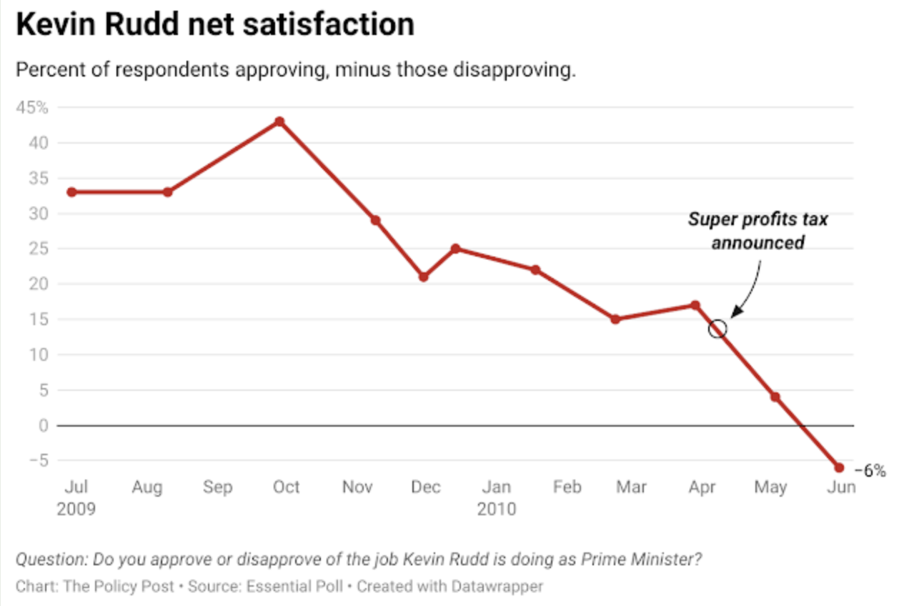 Kevin Rudd, already unpopular with voters and disliked by many in his own cabinet, was vulnerable even before the campaign began. Before the tax was announced, his satisfaction ratings had largely stabilised but his final slide into political oblivion coincided with the mining industry’s campaign. By June 2010 he was gone, voted out of the leadership by the Labor caucus and replaced by Julia Gillard.