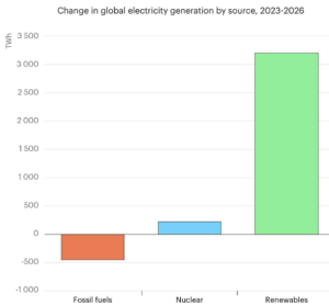 The main news from a climate perspective is that over the next three years additional generation by renewables (plus, joy of joys, a bit more nuclear) is expected to meet all the increased demand for electricity.