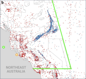 And to wipe the smiles off any smug Australian faces, the map of north-eastern Australia shows high levels of not publicly tracked vessel activity at the southern end of the Great Barrier Reef Marine Park (marine boundaries marked with the green line). To orient you, the green circle is Rockhampton and the orange one is Gladstone.