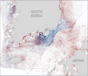 The area between South Korea and Japan recorded 1,975,000 vessels, of which 69% were not publicly tracked.