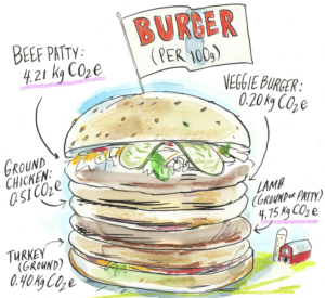 Want to make just one change to your diet to reduce your greenhouse gas (GHG) footprint? Replace beef (whether it be a juicy steak, an aromatic roast, a beefburger or a hotdog) with another protein (lamb isn’t the best choice) in just one meal and you’ll halve your emissions for the day.