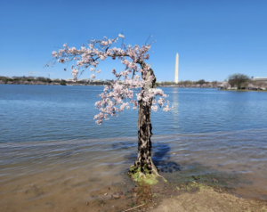 Second, sea level rise is causing problems for the sea wall around Washington’s Tidal Basin and flooding of the area is damaging the trees. Repair of the sea wall will necessitate removal of 158 of the cherry trees, including Stumpy, a crowd favourite.