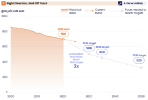 The agricultural sector contributes about 10% of greenhouse gas emissions (GHG) and there is considerable potential to reduce this. Reduction is happening but needs to be three times faster to meet the 2030 target. The graph below shows the past, projected (trend) and required GHGs per 1,000 kilocalories produced on farms. (1,000kcal is what most of us would consume in about 15-18 months and I must confess that I’m surprised to see that produces only 700gm of GHG – tell me if I’ve got something wrong.)