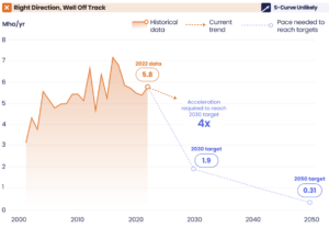 Second, reducing deforestation is critical for both controlling climate change and halting the loss of biodiversity. Again, we’re way off track. The graph below displays the millions of hectares of forest destroyed each year. The conclusion that deforestation is decreasing and just needs to be four times quicker looks optimistic to me.