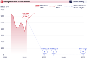 Finally, everyone agrees that public subsidies for fossil fuel activities need to be phased out rapidly. Well, everyone except the companies and the governments of countries that produce or import a lot of fossil fuels. As the next graph of total public funding for fossil fuels demonstrates, the shareholders are the ones with smiles on their faces at present.