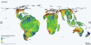 Some of those clever IT types have produced animated videos of the changing GPP around the world during the year. The surface area of countless small plots of land are electronically resized to reflect each one’s GPP each month. If you watch the ‘Nature’s heartbeat’ video, you’ll see the annual summer pulse of life around the world. It all happens very quickly in the video, so I’ve taken screenshots of January and July so that you can compare them more easily.