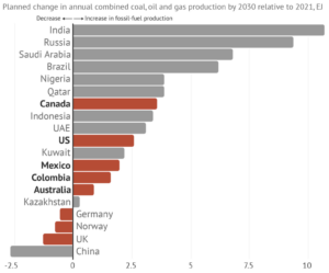 The hypocrisy of some of the nations that strongly supported the decision is evident from the figure below that shows the planned change in total fossil fuel production of nineteen large producers between 2021 and 2030. The red bars represent strong supporters of the decision, five of which are planning to increase their production. But even the ones with plans to decrease production will still be producing plenty.