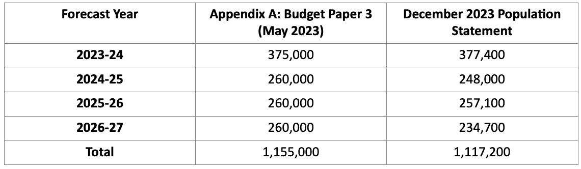 The Government’s latest forecasts for net migration are provided in Appendix A of Budget Paper 3 (published in May 2023) and in the Population Statement by the Treasury Centre for Population (December 2023). These forecasts are in Table 1.
