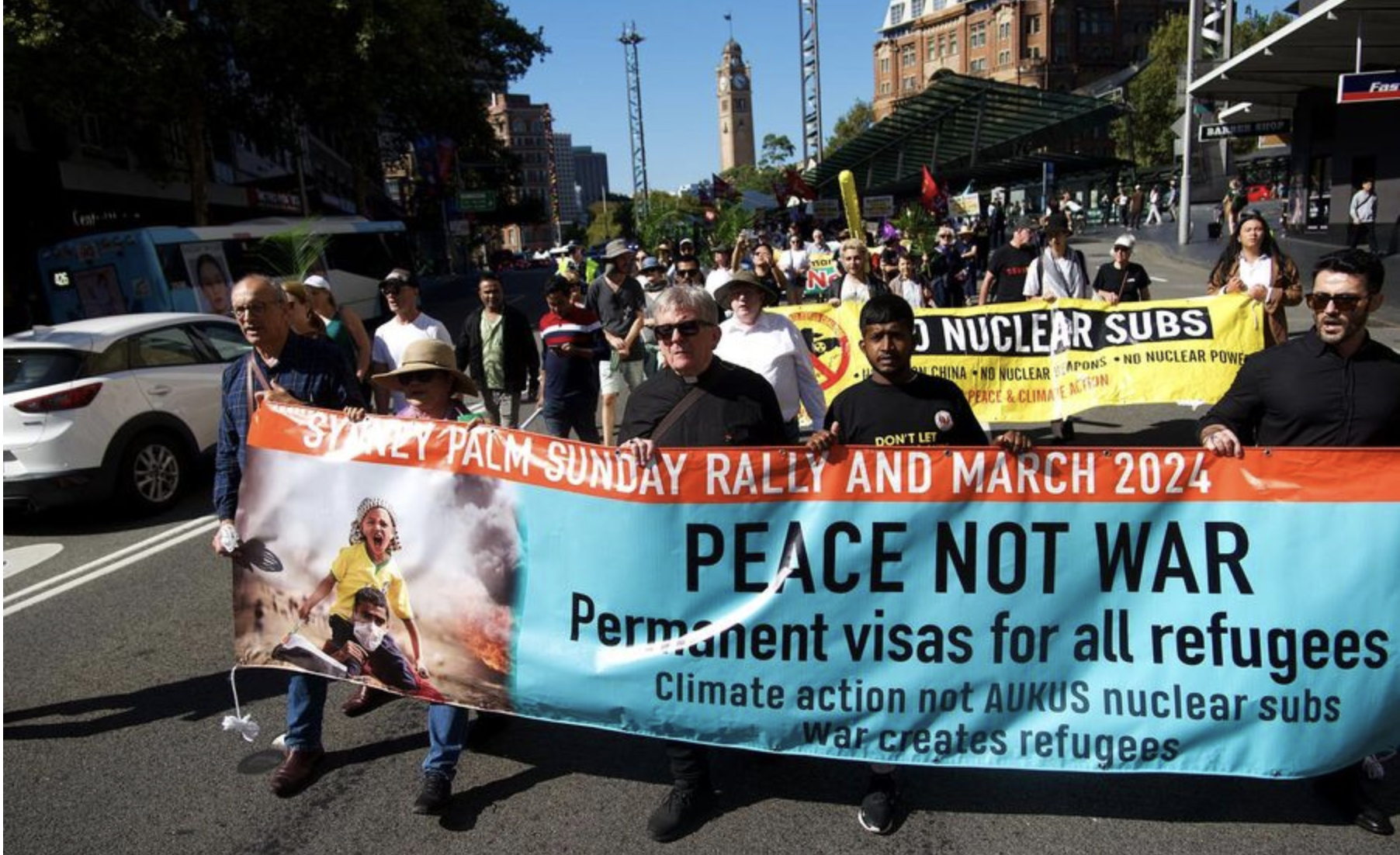 Sydney’s rally today was no exception. Josephite Sister Susan Connelly had plenty to say about the monetary drivers of military expansion. “Christ”, claimed Connelly, “would not be impressed by corporate or political greed”. Money lenders in the temple got mentioned. She emphasised the arrival of Jesus to Jerusalem on a humble donkey rather than the high horse of imperial or even colonial victors.