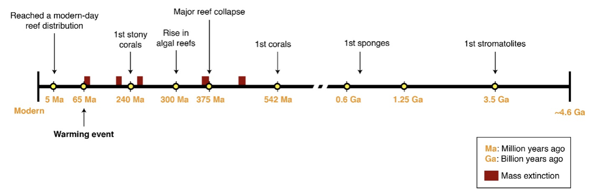 Corals first emerged around 542 million years ago in the oceans of the Precambrian era. Over the next half billion years they underwent five major extinction events, followed by long lags of 5 to 20 million years before they managed to evolve anew. Ancient species, such as the once-plentiful rugose corals, were wiped out in the Great Death of the Permian era, and remain lost forever.