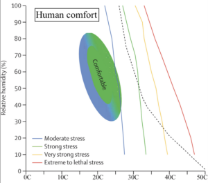 The figure below shows the comfortable range for humans and how heat stress increases as the temperature increases, reaching potentially lethal levels at 30-45oC depending on the humidity. As a rule of thumb, the level of stress jumps up a notch for every 5oC increase in temperature above 25oC. In essence, the levels of temperature, humidity, wind and radiation and the frequency and duration of heat waves are the significant environmental influences on heat stress in humans.
