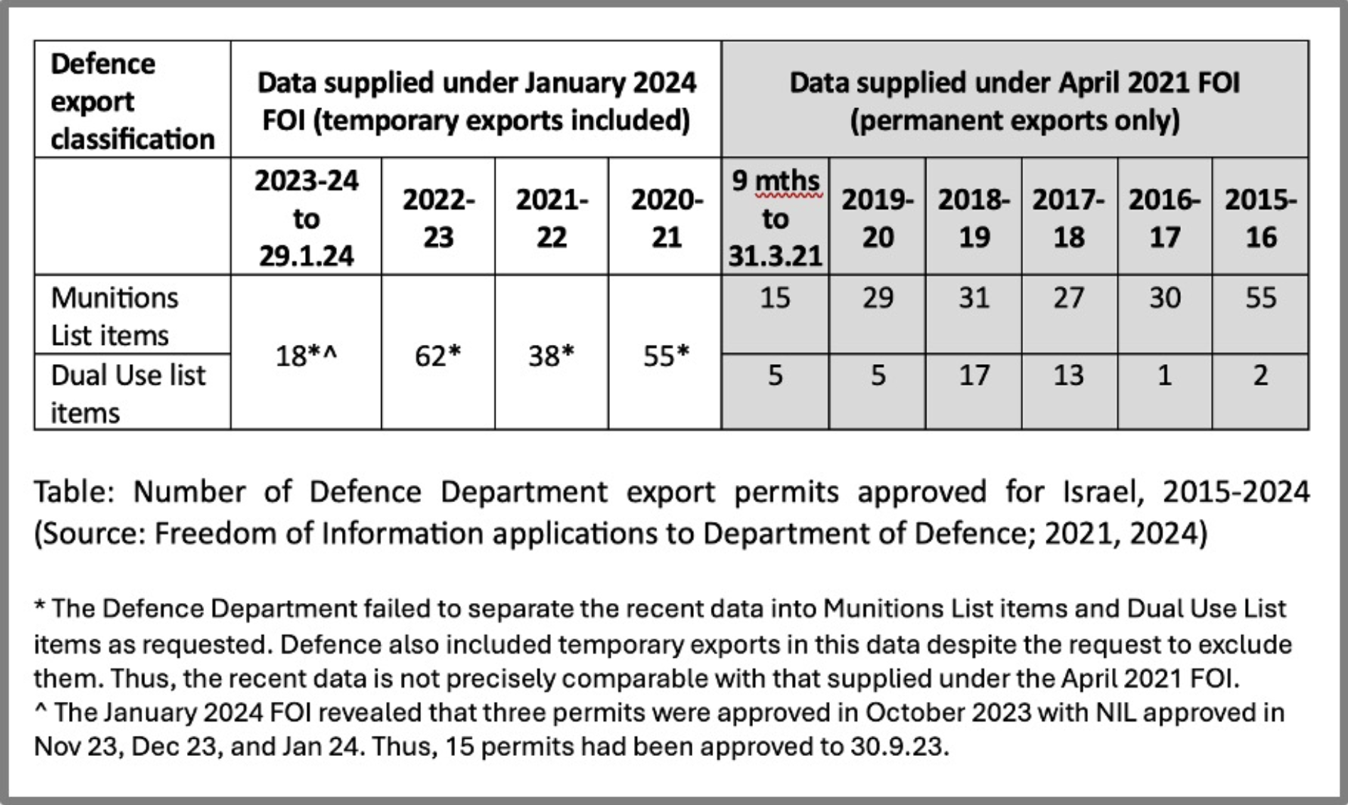 Defence ignored both requests even though it had previously supplied the data in that form (as shown in the table below) – but that was before Israel’s war on Gaza. Defence is now restricting the data it releases, likely with the approval of the minister, Richard Marles.
