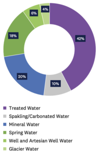The source of ‘treated’ bottled water, which need not be specified and is generally not highlighted in its branding, may be a natural source or a public supply system. Whatever the source, it is often purified or processed in some way. Treated water constitutes 42% of the market for bottled water by volume.