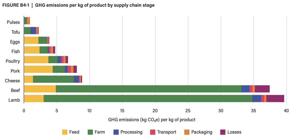One final point: consuming locally produced meat makes almost no difference to the GHG emissions because transport accounts for only 1% of beef- and lamb-related emissions. That’s not to say there aren’t other good reasons to be a locavore.