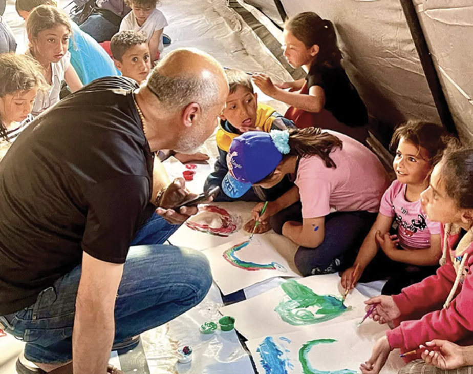 Basel El Maqosui, a founder of Shababek, hosting art sessions with displaced children in Gaza strip, May 2024.