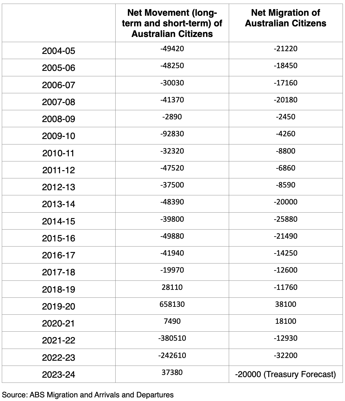 Table 1 shows the net migration of Australian citizens (ie long-term movements) broadly follows the pattern set by the net movement (short and long-term) of Australian citizens.
