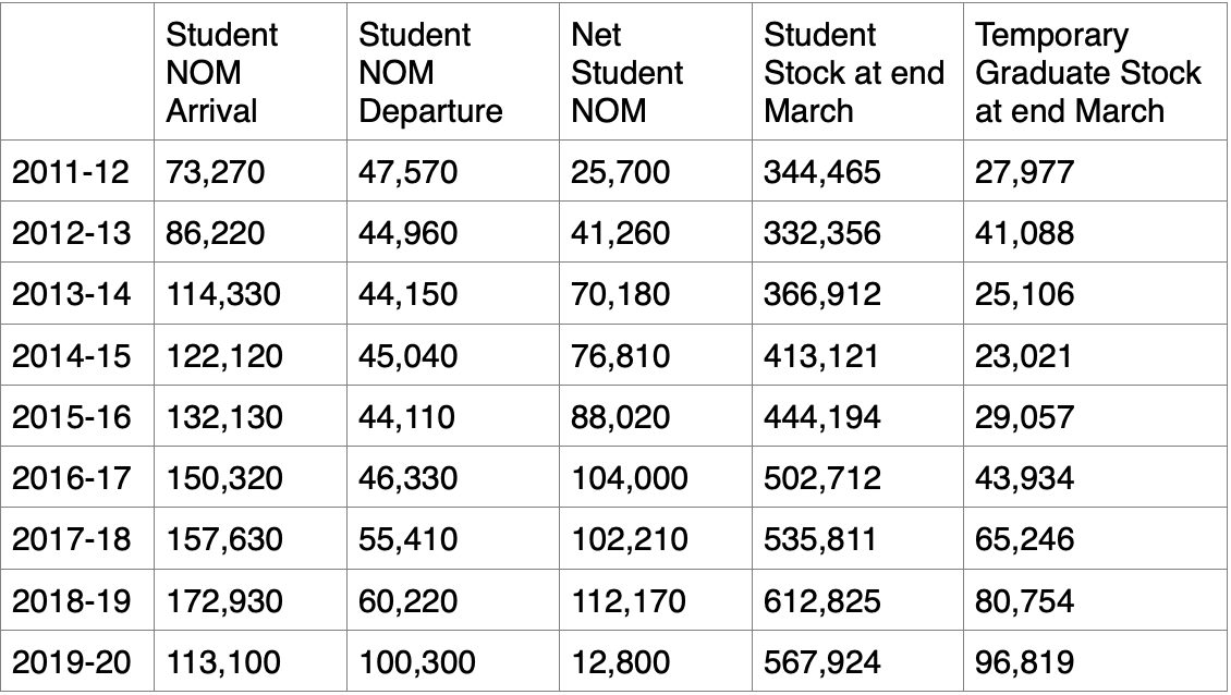 Over the past decade, the student contribution to net migration (ie students arriving and staying long-term minus students who stayed long-term departing permanently) has grown significantly other than during covid (see Table 1).