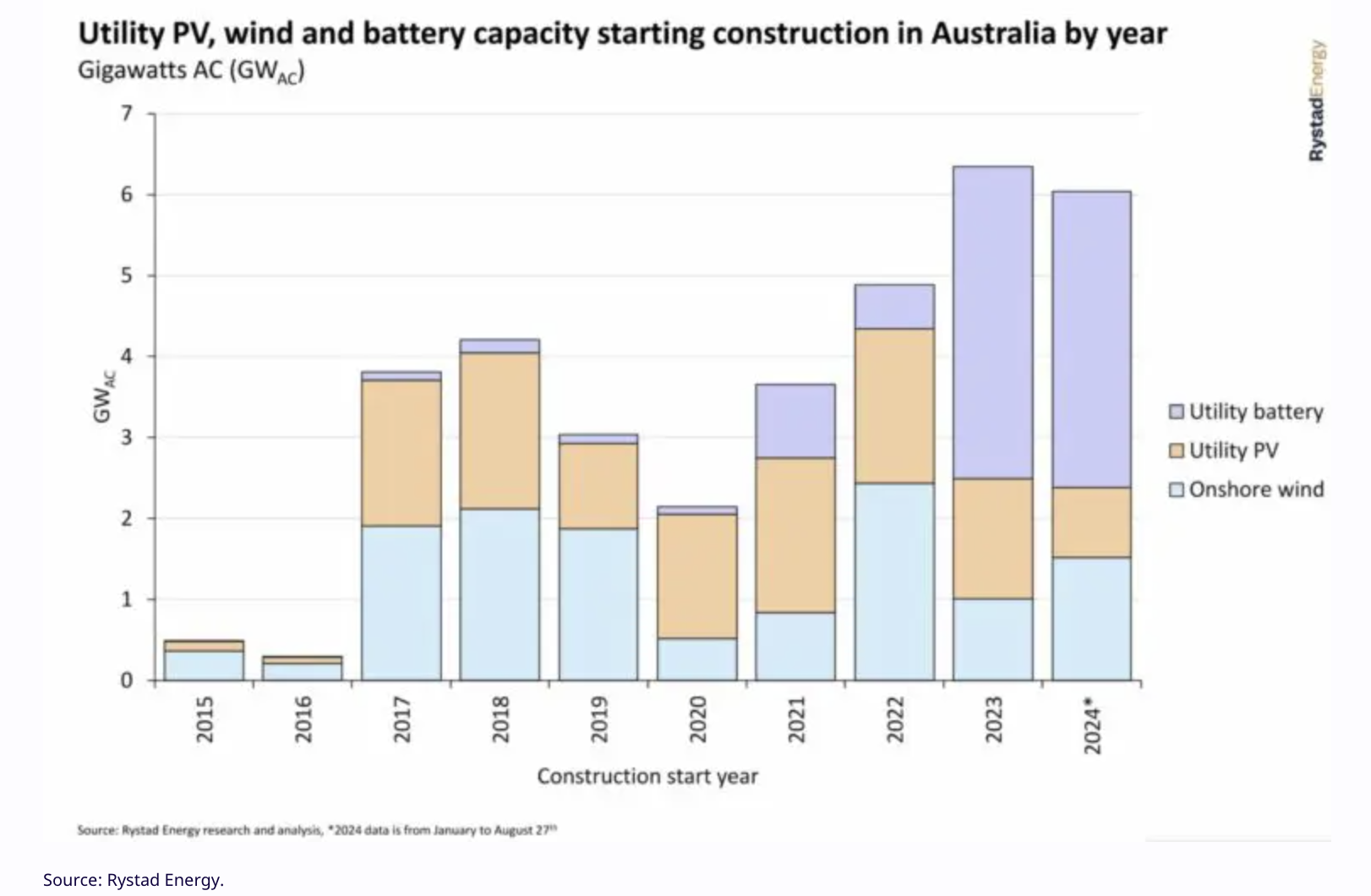 According to energy industry analysts at Rystad Energy, the construction starts for big battery projects in Australia are already approaching their 2024 forecasts of 4 GW, and are likely to exceed that number given the huge pipeline of projects, the falling costs of battery cells, and the various storage tenders being held around the country.