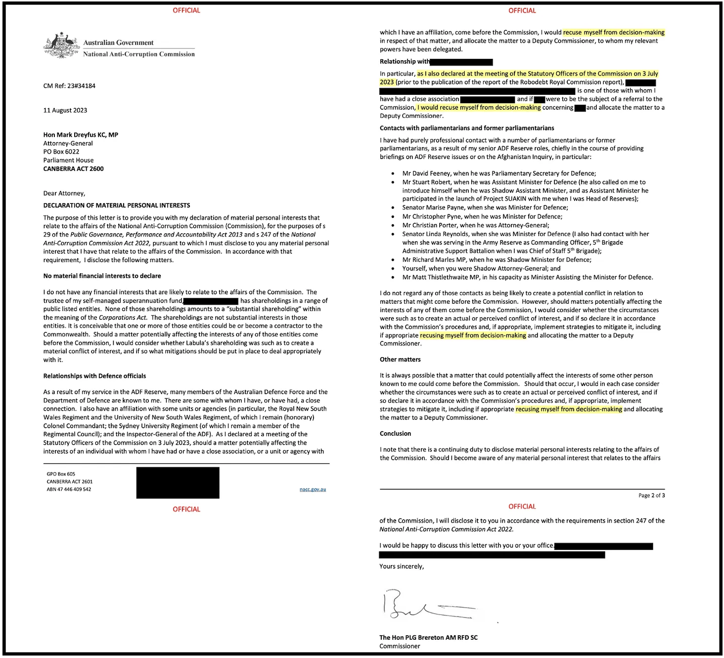 In the letter Brereton tells Dreyfus — twice — that he told his senior NACC colleagues in a meeting on 3 July last year that should a matter affecting someone with whom he has had, or has, a close association come before the Commission, he would “recuse myself from decision making” and “allocate the matter to a Deputy Commissioner”.