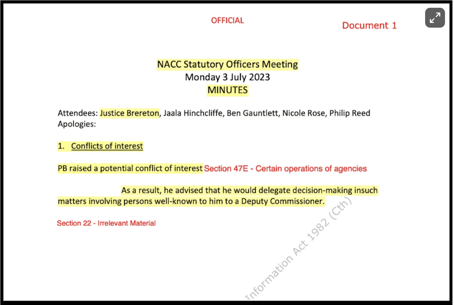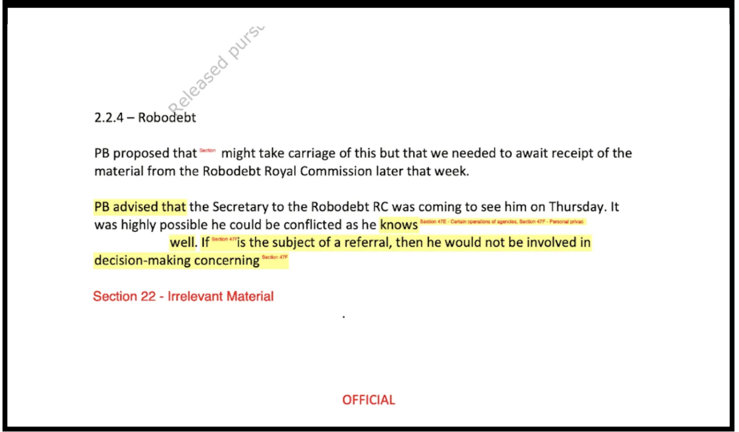 The above extracts come from a NACC Freedom of Information release of documents to a prominent researcher and writer, who works as Jommy Tee, who requested access to: “All documentation held by the NACC associated with the Commissioner and conflict of interest issues in relation to the Robodebt Royal Commission referral.”