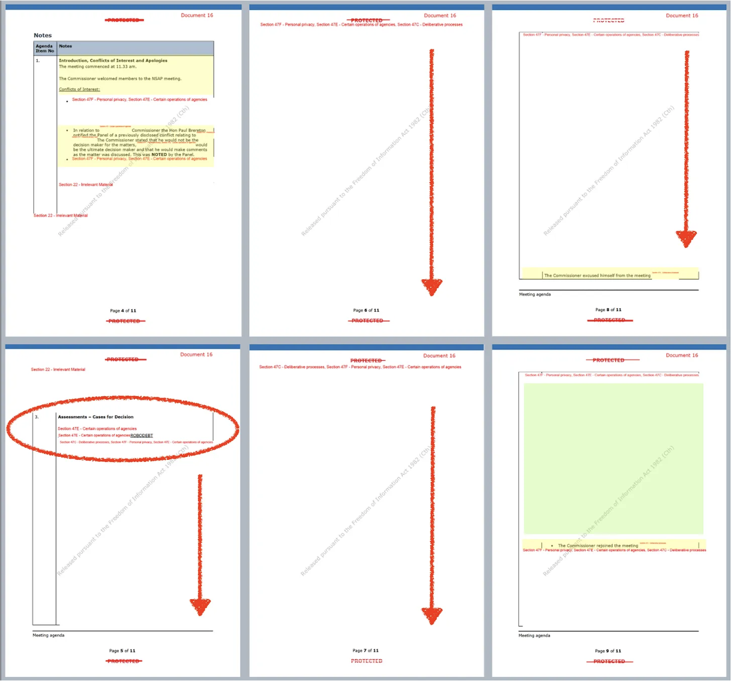 Brereton was intimately involved in the NACC Robodebt “decision” meeting on 19 October 2023, as shown by the red arrows. The period the Commissioner was outside the room is shown in green. Document source: NACC FOI. Screenshot markup: The Klaxon.