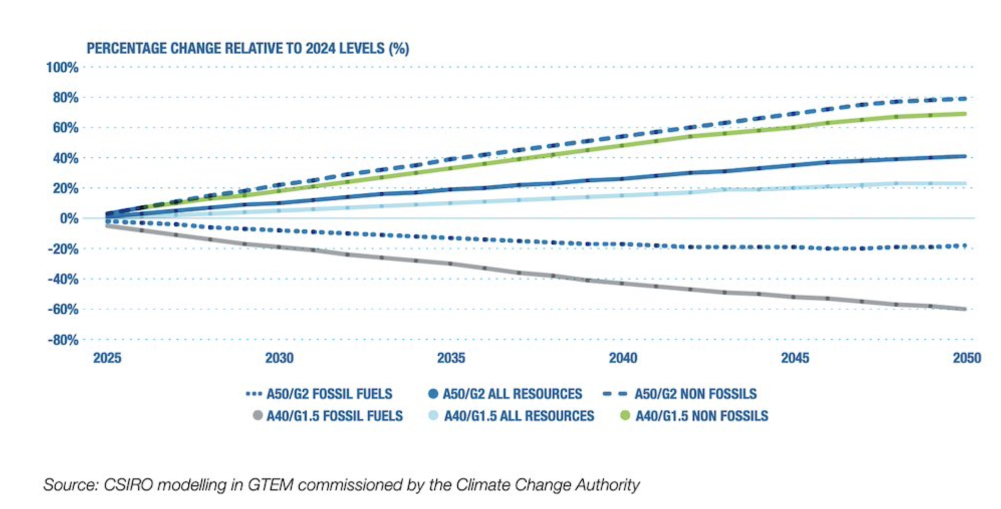But as the chart below shows, even under the more ambitious 1.5°C decarbonisation scenario, fossil fuel contribution to resources sector output reduces by just 60% by 2050.