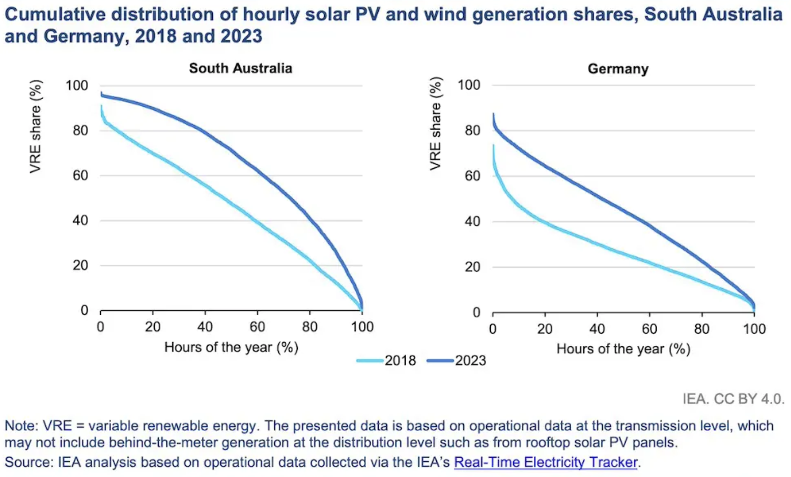 In its latest global stocktake of variable renewable energy integration across 50 power systems, the International Energy Agency says South Australia has joined the ranks of grids with the highest share of solar and wind in the world.