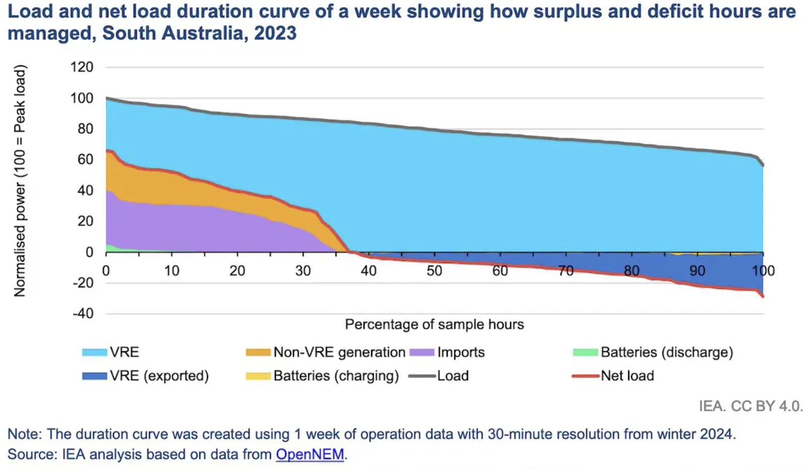 On the IEA’s scale, this puts South Australia in Phase 5 of the integration of renewables (Phase 6 is the top ranking), managing a share of solar and wind that averages out to be higher than fossil fuels over most of the year and at times surpasses 100% of local demand.