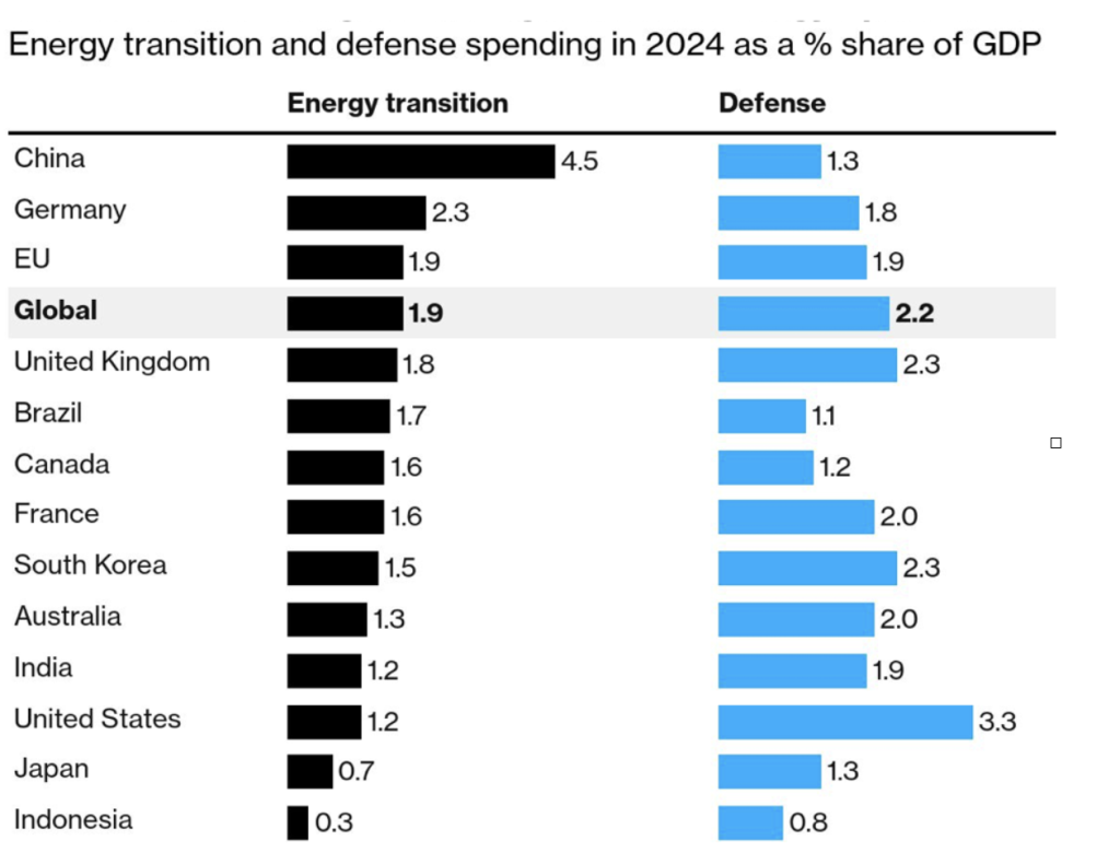 The table above, from Bloomberg Green Daily on 1 April, compares the percentage of global and selected countries’ GDP directed to defence and the energy transition. While I would prefer to see the global ratio reversed, to be honest, I’m pleasantly surprised that the two figures are so close.