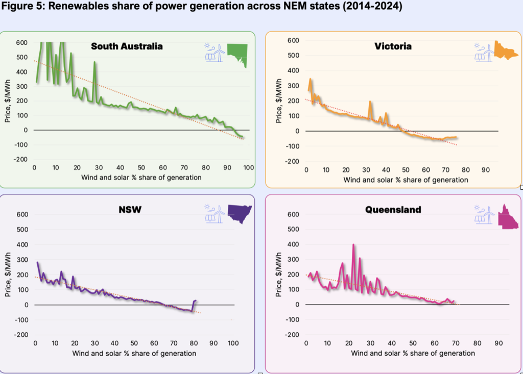 The graphs below demonstrate that across the four mainland states of eastern Australia the wholesale spot price of electricity has fallen and become less volatile as the percentage of wind and solar in the electricity generation mix has increased.