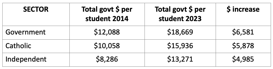 His “adjusted” figures claim that between 2009 and 2023, public funding for Catholic schools rose by $3101 per student, for Independent schools by $2708, and for government schools, by just $2091.