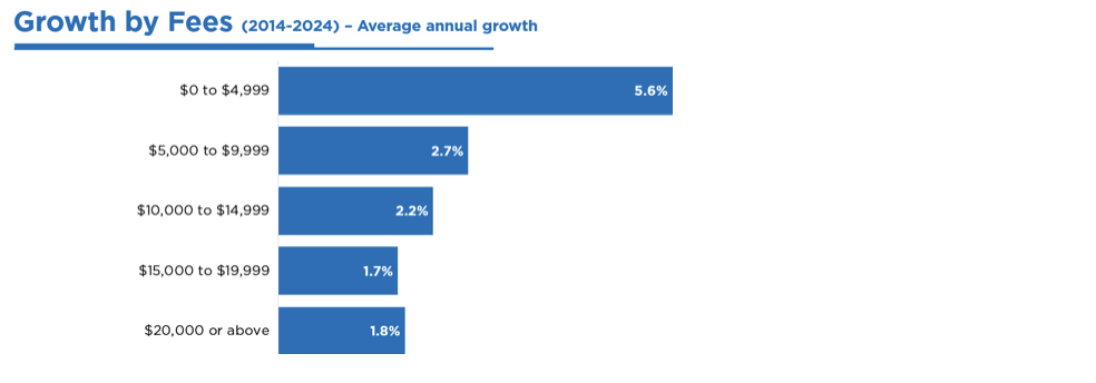 As this graph shows, the fastest annual growth in enrolment in NSW Independent schools has been among schools charging less than $5000 per year – usually Christian, Islamic, Anglican, Adventist and secular schools serving low to middle income families (it’s a similar story nationally).