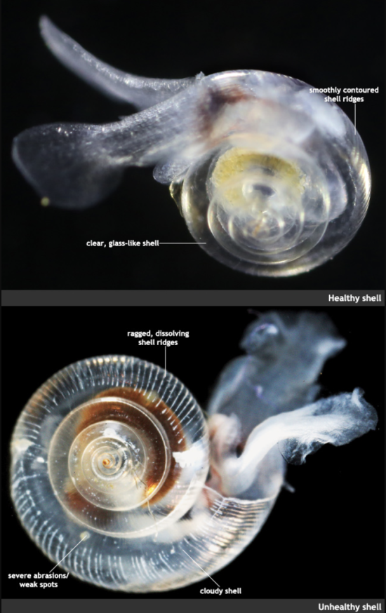 Pteropods dissolving from ocean acidity. Images credit: NOAA