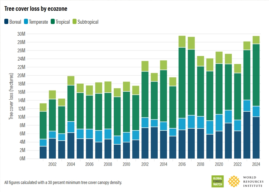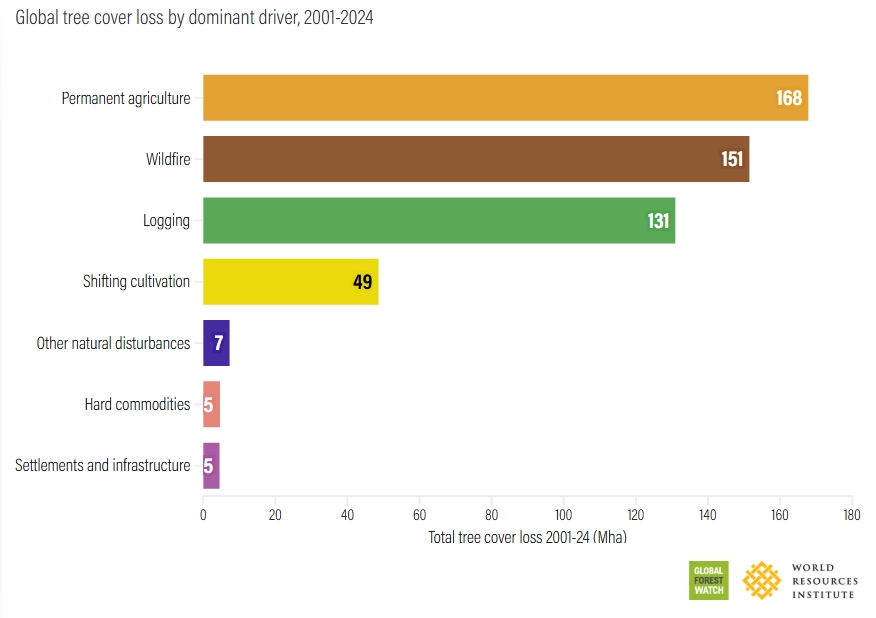 Figure 1. Causes of global tree cover loss 2021-24. Source: Global Forest Watch, 2025.