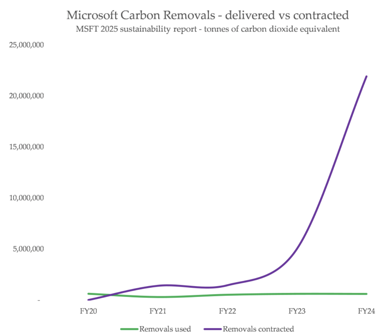 From 2022 Microsoft performed very well purchasing carbon credits to cover its emissions, as shown in the next graph. The only small problem is that the purchased credits haven’t actually delivered the CO2 removal promised, a widespread carbon offset stumbling block.