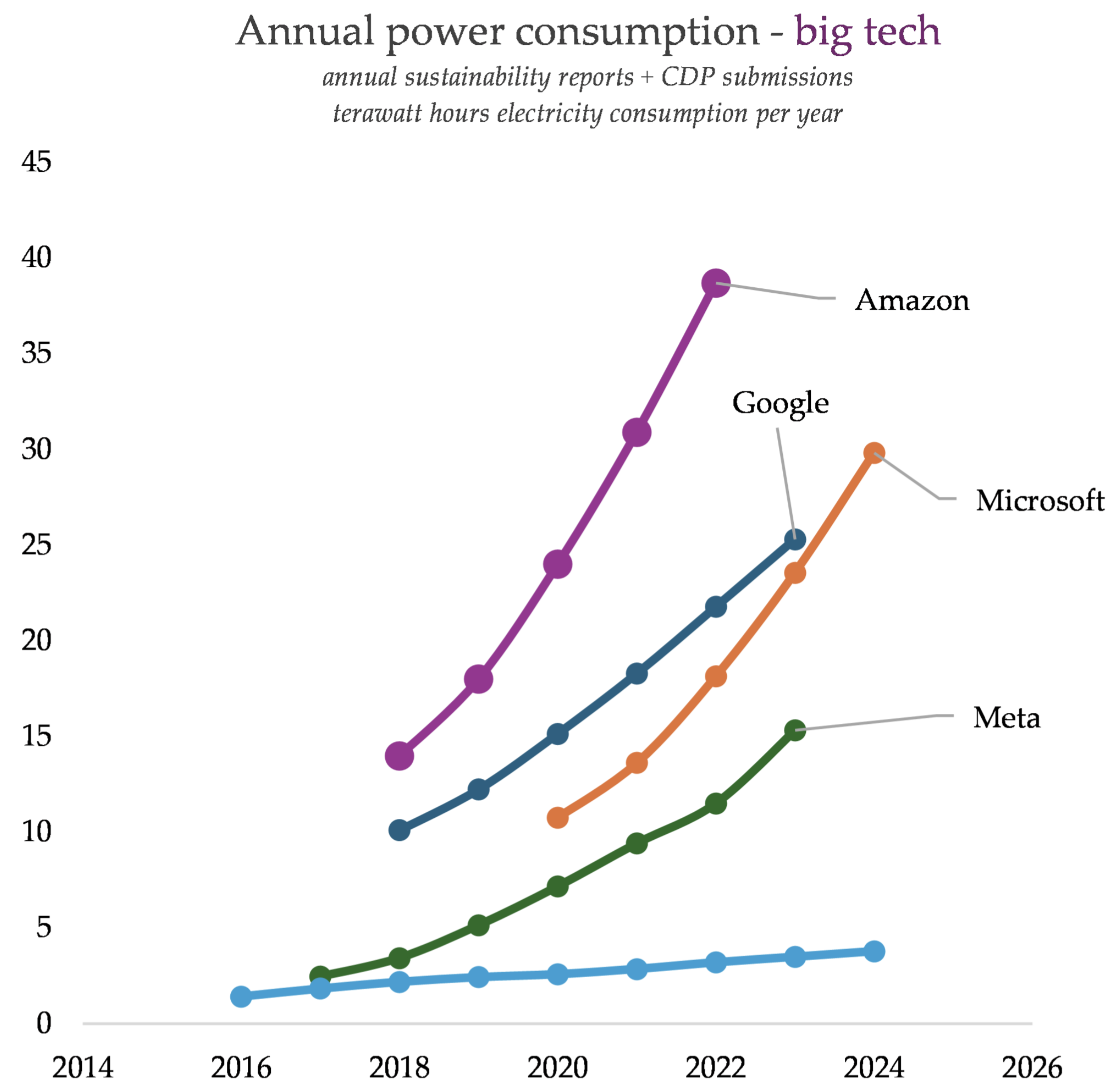 First, since 2020, Microsoft’s power consumption has been increasing at an increasingly rapid rate and is now triple what it was in 2020 (see graph below – the missing company name is Apple).