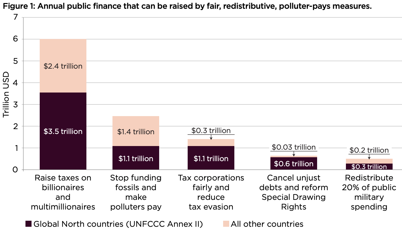 The failure of wealthy countries to provide adequate climate finance to poor and developing countries is rendered even more disgraceful in the knowledge that rich countries could unlock US$6.6 trillion per year for climate action and important social programs such as healthcare and housing by: