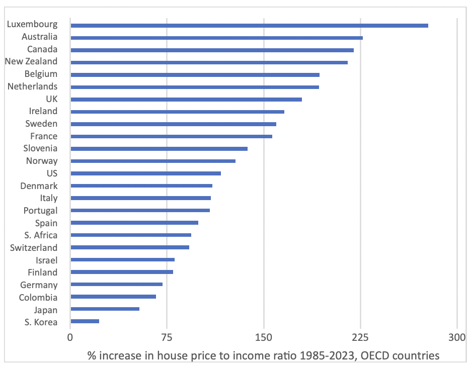 But, as laid bare in our new book, the performance of Australia’s housing system has been on the slide for decades. And although hardly unique to this country, powerful statistical evidence demonstrates that, over the long term, the situation has worsened more markedly here than in any major comparator country. Since 1985, Australia’s house price to income ratio has grown by 226%; ahead of Canada (220%), the UK (180%) and the US (117%).