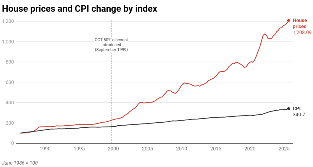 Each year, Treasury calculates the costs of tax policies. This data reveals that in 2024–25 the 50 per cent discount cost the budget an estimated $19.7 billion. This is partly driven by increases in housing prices which have far outpaced inflation, as shown below.