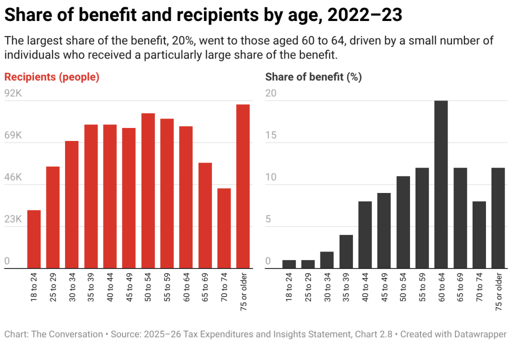 The Treasury’s Tax Expenditure and Insight Statements show that in 2022–23 89 per cent of the benefit went to the top 20 per cent of income earners, with 86 per cent flowing to those in the top 10 per cent. On average, the highest income earners received a benefit of more than $86,000, while those in the bottom 60 per cent received around $5,000.