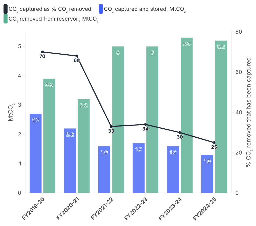 Unfortunately, things aren’t going well. As the histogram below demonstrates, in 2019-20 the project captured 2.7MtCO2 (blue columns), 70 per cent of the total CO2 in the gas extracted (green columns). That was the high-point. In 2024-25, the project captured 1.3MtCO2, 25 per cent of the total CO2 in the gas extracted. So in six years of operation the amount captured has halved and the percentage captured is a little over a third of the first year. Since the beginning, Gorgon’s CCS project has dumped more than twice as much CO2 into the air as it has stored underground.