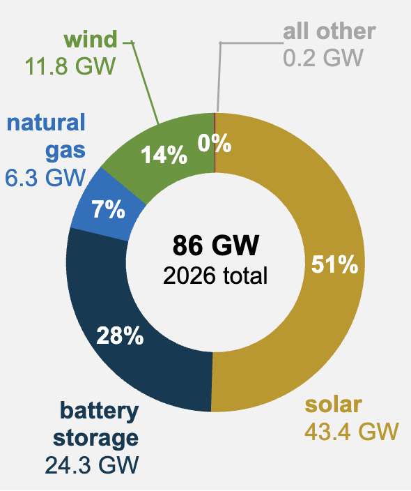From all the President’s bluster about the future being in fossil fuels and his efforts to halt the roll out of wind and solar power, you would think that the US is investing big in new coal and gas powered electricity-generating plants. But the US government’s own figures show a very different story. Solar (51 per cent), battery storage (28 per cent) and wind (14 per cent) account for 93 per cent of the planned 86 gigawatt (GW) increase in utility-scale electricity generating capacity in the US during 2026. The other 7 per cent will be natural gas.