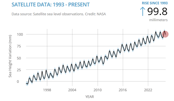 Human activity also affects sea level rise by pumping out groundwater, which is released into rivers, adding to sea level rise while at the same time causing coastal cities to sink. Over the period 1993-2024, we pumped out an estimated 2.15 billion tonnes of groundwater a year, 80 per cent of which ended up in the oceans. This has the compound effect of causing many cities to sink while seas rise.