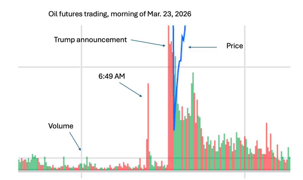 This “sharp and isolated jump in volume” – which you can see for the oil futures market in the chart below – was especially bizarre because there were no major publicly available news items to drive sudden big market transactions. The story would be baffling, except that there’s an obvious explanation: somebody close to Trump knew what he was about to do, and exploited that inside information to make huge, instant profits.