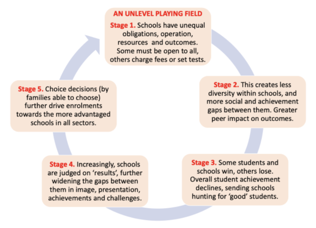 The cycle helps explain what we have created, and understand what went wrong – and why reforms to date haven’t fixed it. The resulting drama, with multiple impacts on families, schools and communities, plays out in full view in just about every Australian community. It includes the stress within some families over school choice, and the discontent in others without any choice. The fallout from our dog-eat-dog system impacts on family well-being, health and housing, urban transport and quality of life.