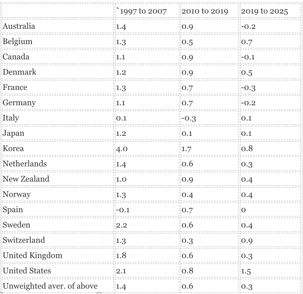 Furthermore, if government policies could make much difference to the rate of productivity growth then we would expect to see more difference between the experience of different countries. However, as Table 2 shows the slowdown in productivity growth since the Global Financial Crisis, with even less productivity growth in the 2020s, has affected all the advanced economies, including Australia, to much the same extent. And this common productivity experience is because all the advanced economies adopt new technologies at much the same time and rate.