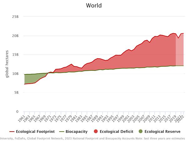 This is resulting in what the researchers term a ‘biocapacity deficit’ caused by our living beyond the Earth’s renewable biological resources. This deficit began in the early 1970s.