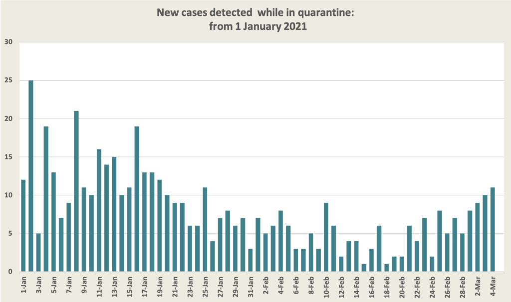 It seems that a degree of complacency has set in, along with a false belief that all can return to normal once we have had the jab. But in fact we are at a dangerous point, because after a lull associated with tight reductions in arrivals from overseas, the number of cases being detected in quarantine is now rising, as shown in the graph below.